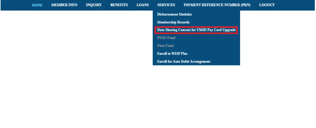 2. Click “Services” Tab in the menu. Select “Data Sharing Consent for UMID Pay Card Upgrade”