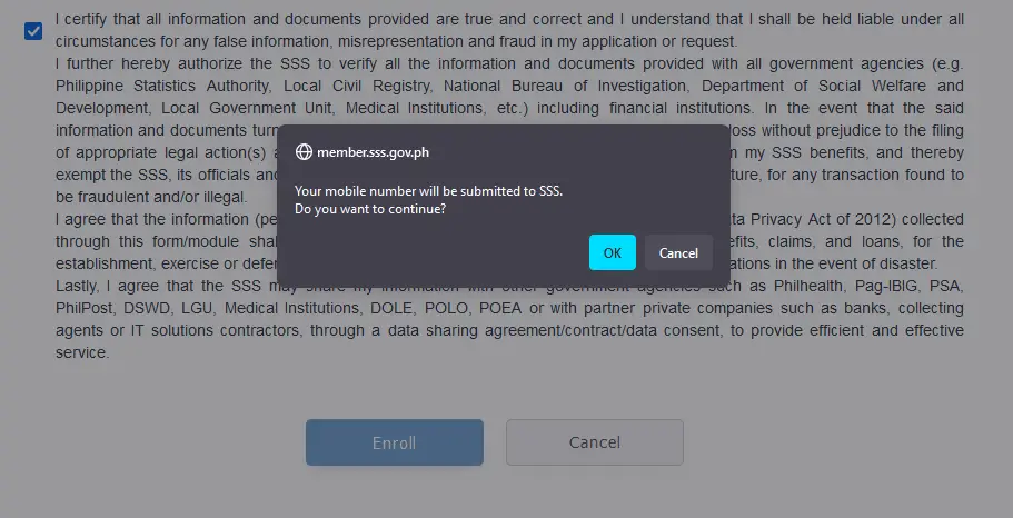 9. Tick the Box to certify that the information presented are true and will be used in SSS transactions. Then click “Enroll” to proceed with the submission of transaction.